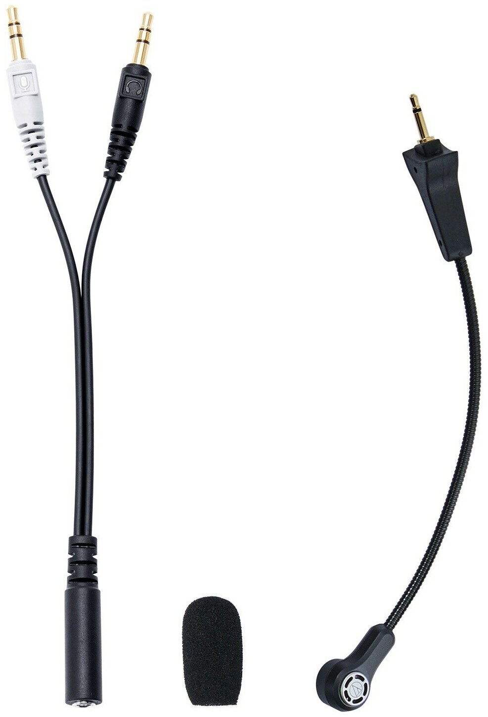 Comes with a short Y-type adapter cable to separate the headphone and microphone signals and a pop filter