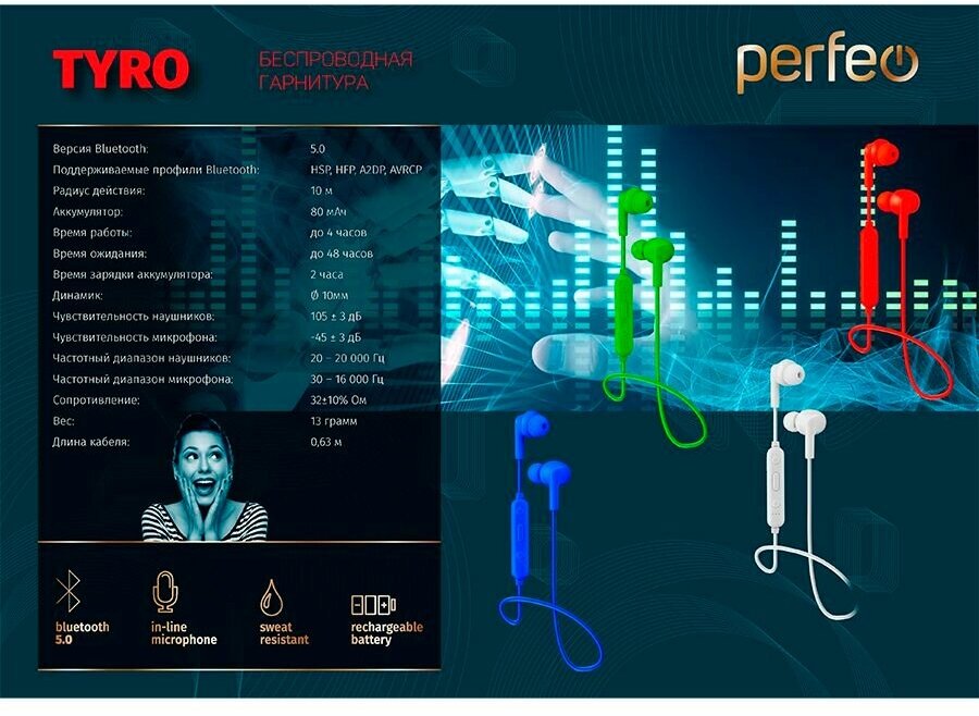 Design: in-ear, device type: wireless headphones, design features: microphone, plug connector: mini jack 3.5 mm, type of acoustic design: closed, operating time: 4 h