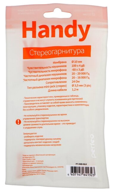 Perfeo Headphones Perfeo HANDY, vacuum, microphone, 100 dB, 24 Ohm, 3.5 mm, 1.2 m, black
