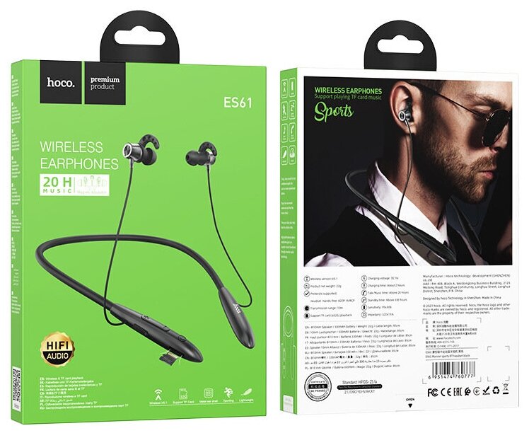 Wireless sports Bluetooth headphones, Hoco ES61, 20 hours of music, black.