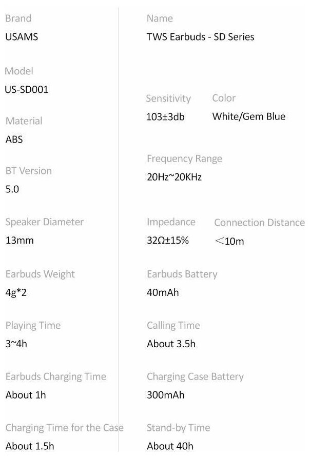USAMS-SD TWS Earbuds BT 5.0 Wireless Headphones blue