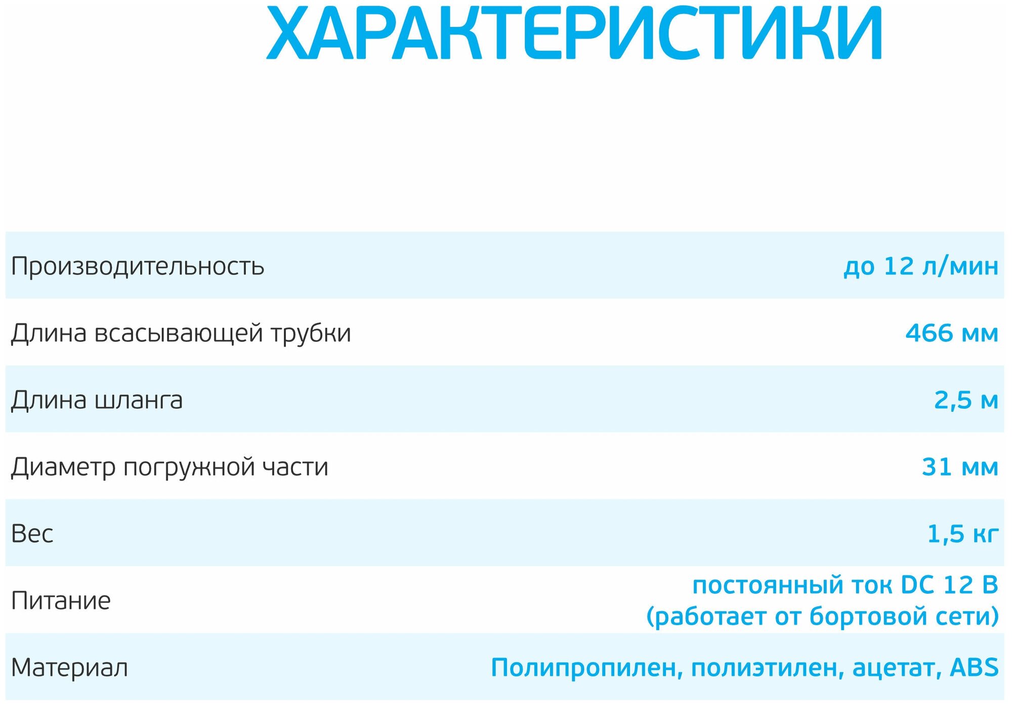 Power supply 12V; productivity: 12 l/min; suction tube diameter: 31 mm; suction tube length: 466 mm; hose length: 2.5 m