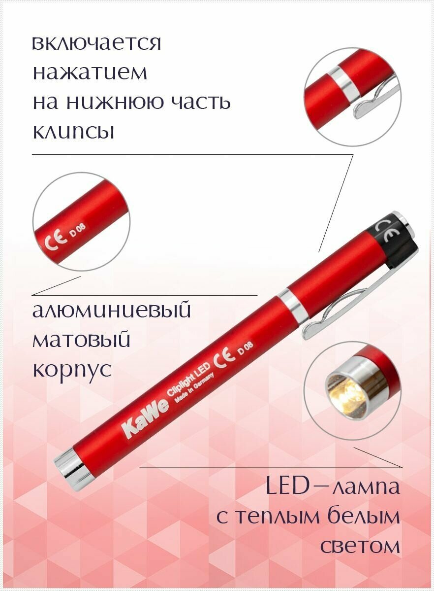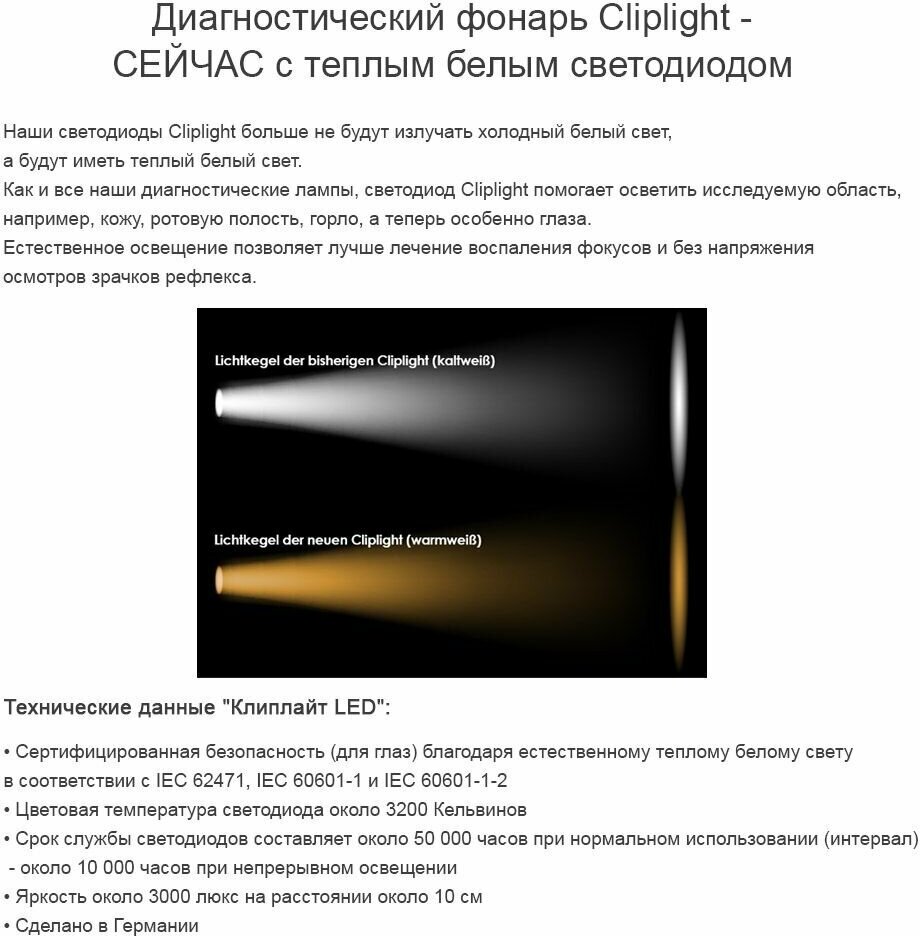 Type of instrument: diagnostic flashlight, field of medicine: otolaryngology, dermatology, therapy, ophthalmology