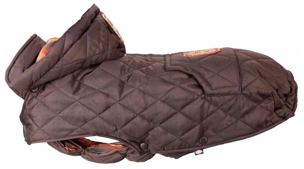 Dirt-repellent lining, elastic bib, leash ring, detachable hood, elastic hind leg loops; size adjustment with a drawstring on the back