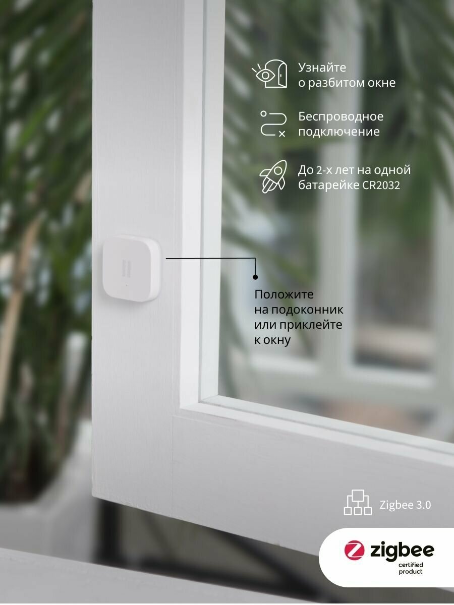 Type: vibration glass break sensor, principle of operation: vibration, type of detection zone: surface, autonomous, installation method: consignment note. surface, IP rating: IP44, ecosystem: Apple HomeKit, Xiaomi Mi Home