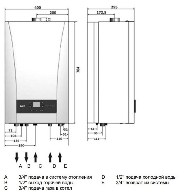 Type of heating boiler: gas, max. thermal power: 24 kW, number of circuits: double-circuit, placement: wall-mounted, fuel: natural gas, liquefied gas, type of combustion chamber: closed, type of power supply: single-phase, at
