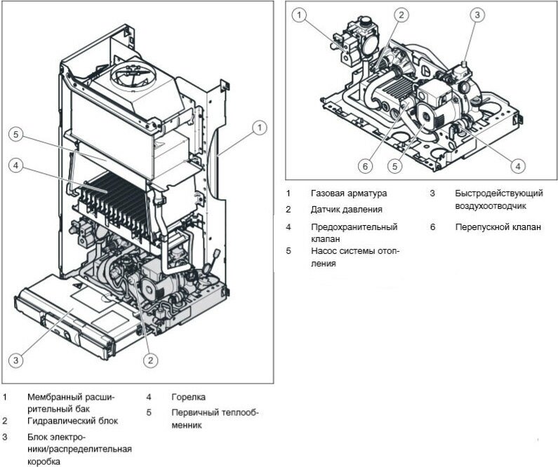 Air vent, built-in expansion tank, built-in circulation pump, pressure gauge, safety valve, connector for external control, thermometer