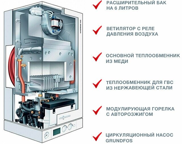 Type of heating boiler: gas, max. thermal power: 24 kW, number of circuits: double-circuit, placement: wall-mounted, fuel: natural gas, liquefied gas, type of combustion chamber: closed, type of power supply: single-phase, at