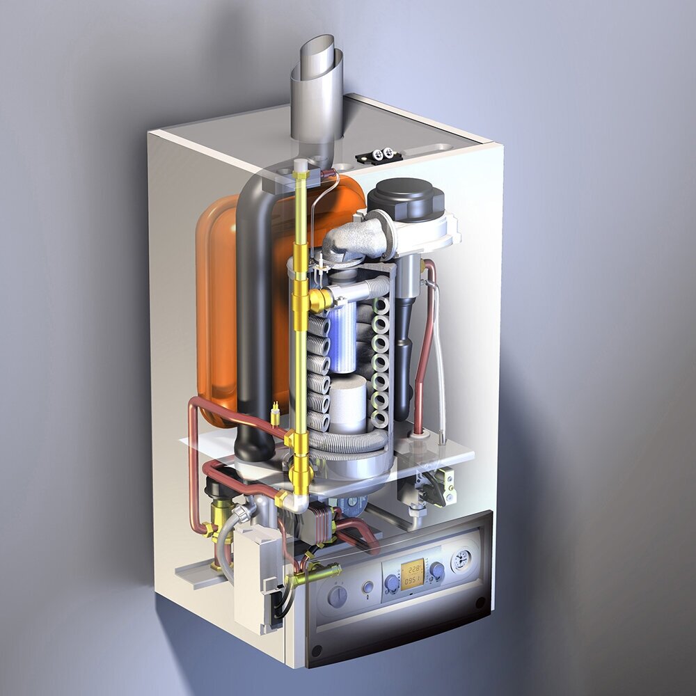 Built-in expansion tank, built-in circulation pump, pressure gauge, external control connector, thermometer