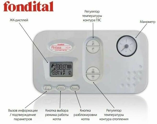 Air vent, built-in expansion tank, pressure gauge, safety valve, connector for external control, thermometer