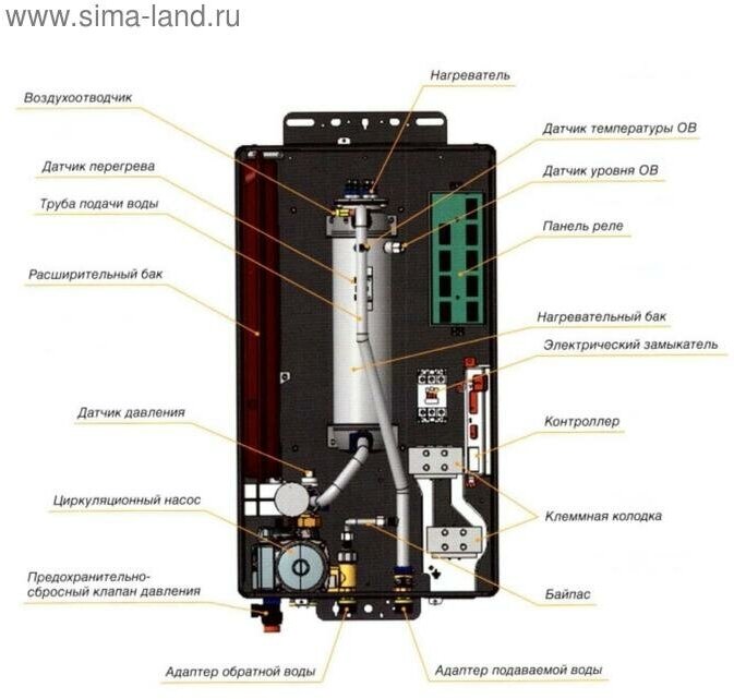 Built-in expansion tank, built-in circulation pump, pressure gauge, safety valve