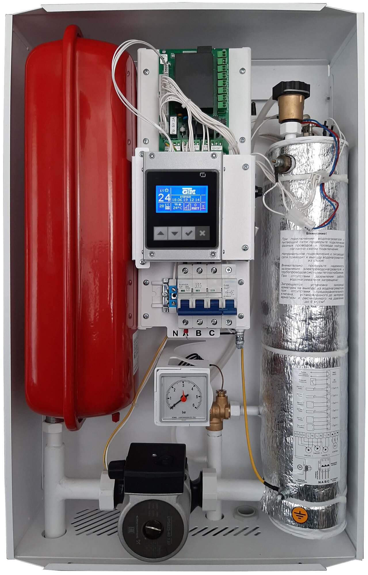 Built-in expansion tank, built-in circulation pump, pressure gauge, safety valve