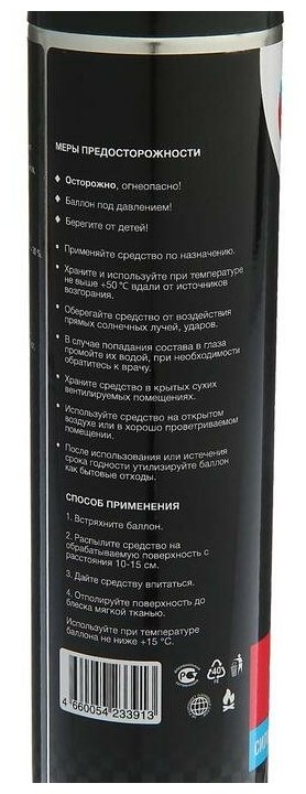 Shake the balloon; spray the product onto the surface to be treated from a distance of 10-15 cm; let the product soak in; buff the surface to a shine with a soft cloth