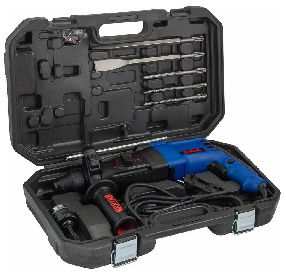 Equipment: Case, 3 SDS+ drills 8/10/12/150 mm, pike, chisel, adjustable side handle, additional chuck, adapter