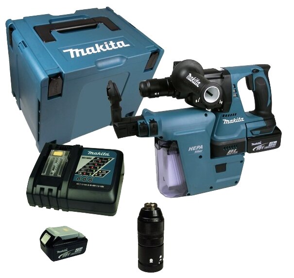 Auxiliary handle, drilling depth gauge, 2 x BL1850 batteries, DC18RC charger, keyless chuck, dust bag, Makpac case