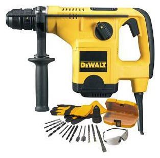 Rotary hammer, suitcase, multi-position side handle, quick-release chuck, quick-change 3-jaw chuck, 2 SDS-plus drills, 20 mm SDS-Plus flat chisel, 4 HSS drills, 4 wood drills, 20 mm spade bit, 25 mm spade bit
