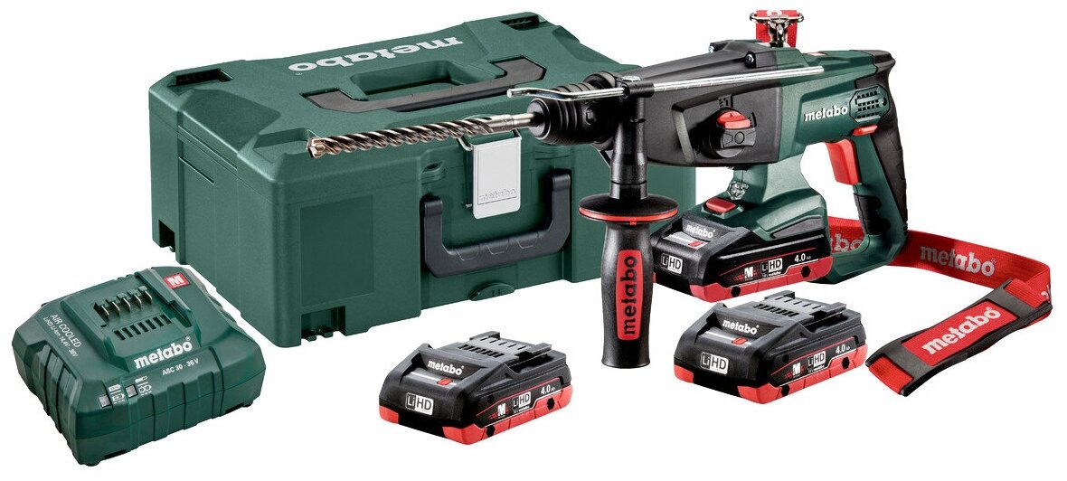 Three batteries, charger, additional handle, drilling depth gauge, carrying strap, MetaLoc case