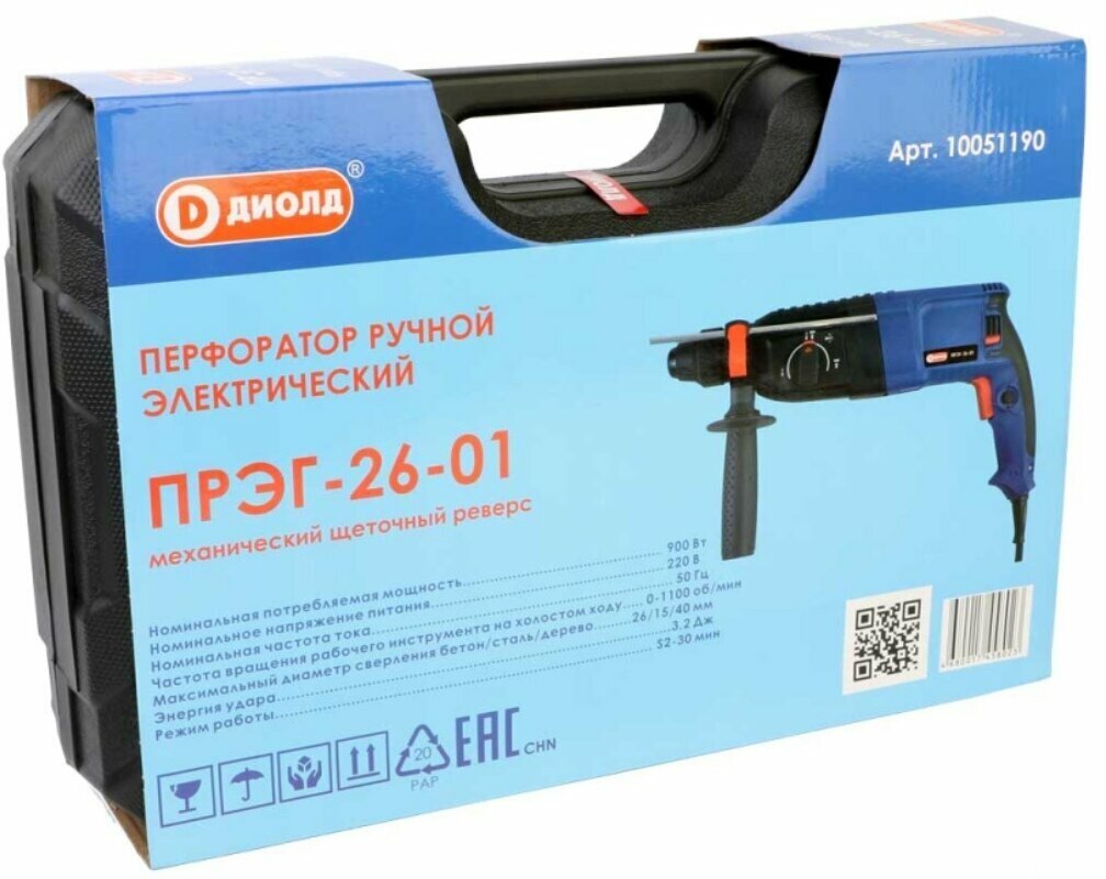 Perforator, case, M6x20 screw, additional key chuck, additional handle, lubrication, SDS-plus 6, 8, 10 mm shank drills, dustproof ring, flat chisel, pointed chisel, depth gauge stop head