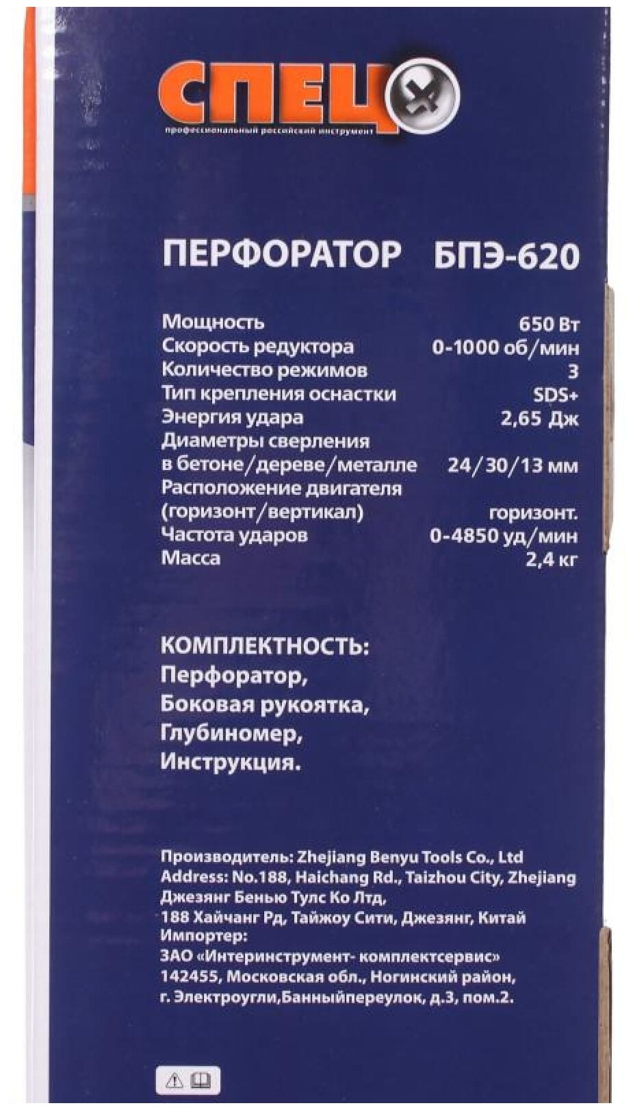 Equipment: Electric hammer drill, side handle, depth gauge, instruction