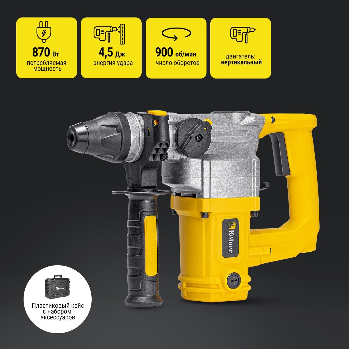 Additional removable handle, depth gauge, drill 3 pcs., chisel, pike, boot, grease container, grease compartment key, plastic case