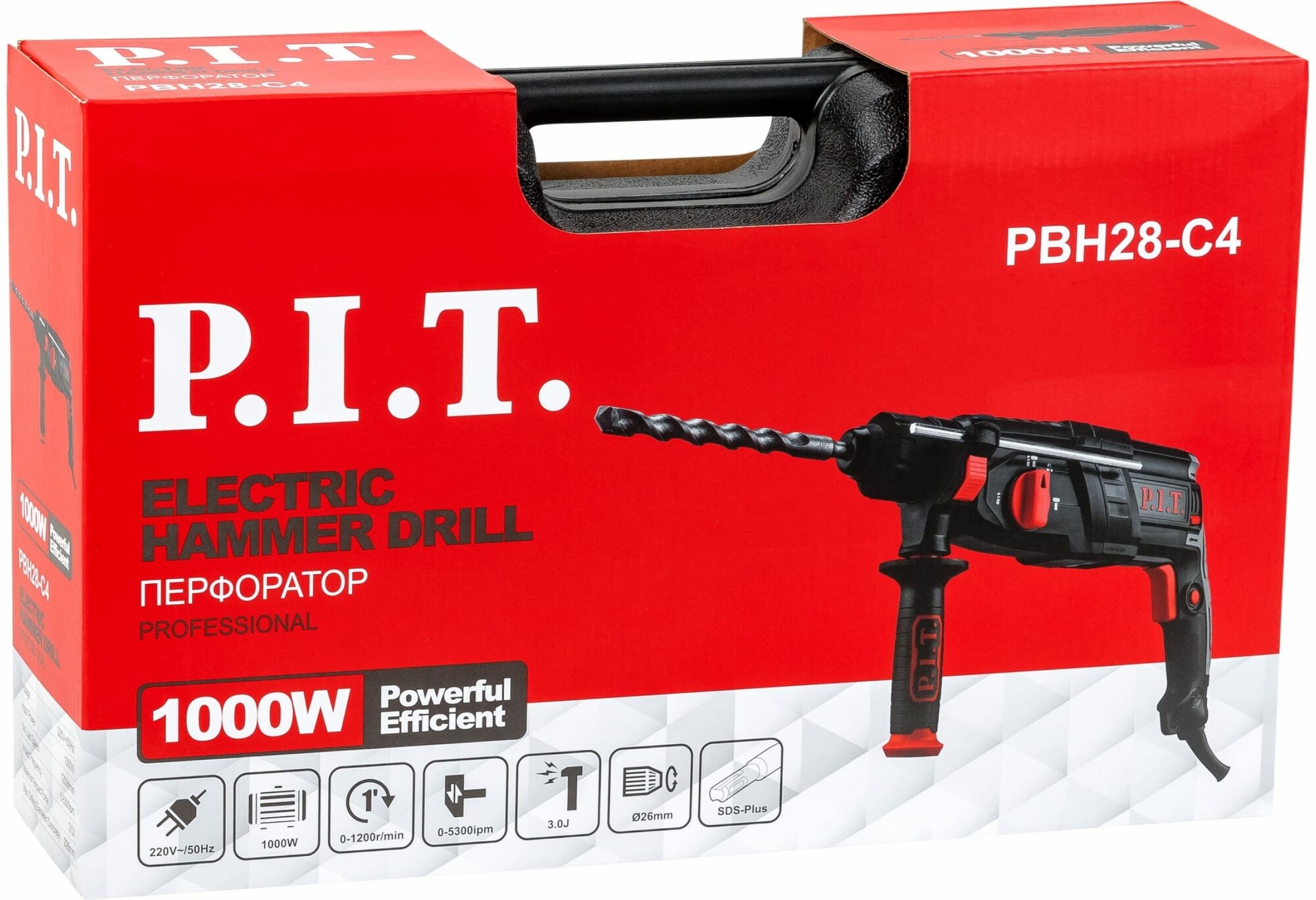 Perforator, plastic case, adapter, drills 3 pcs, flat chisel, drilling depth limiter, additional handle, instruction manual