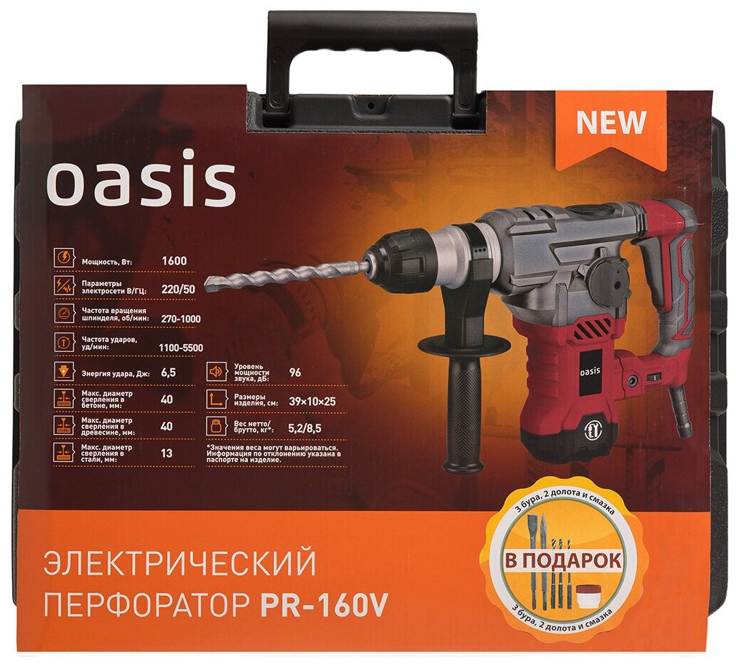 Keyless chuck, chisel, additional handle, additional set of brushes, case, wrench, drills, grease pack