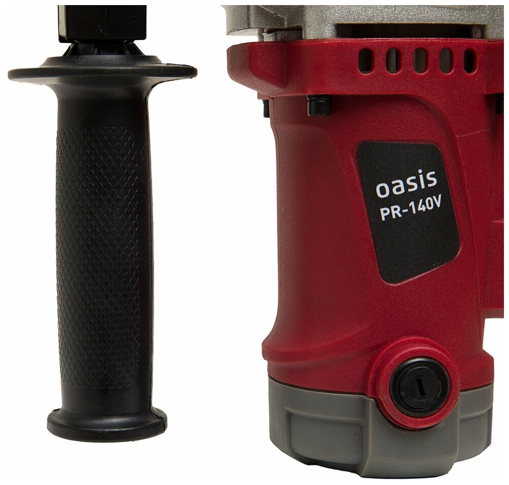 Hammer drill, case, additional handle, pointed chisel 14×250 mm, flat chisel 14×250 mm, set of three drills 8/10/12×150 mm, lubricant, dust cover, drilling depth gauge, wrench, carbon brush – 2 pcs. ., hand