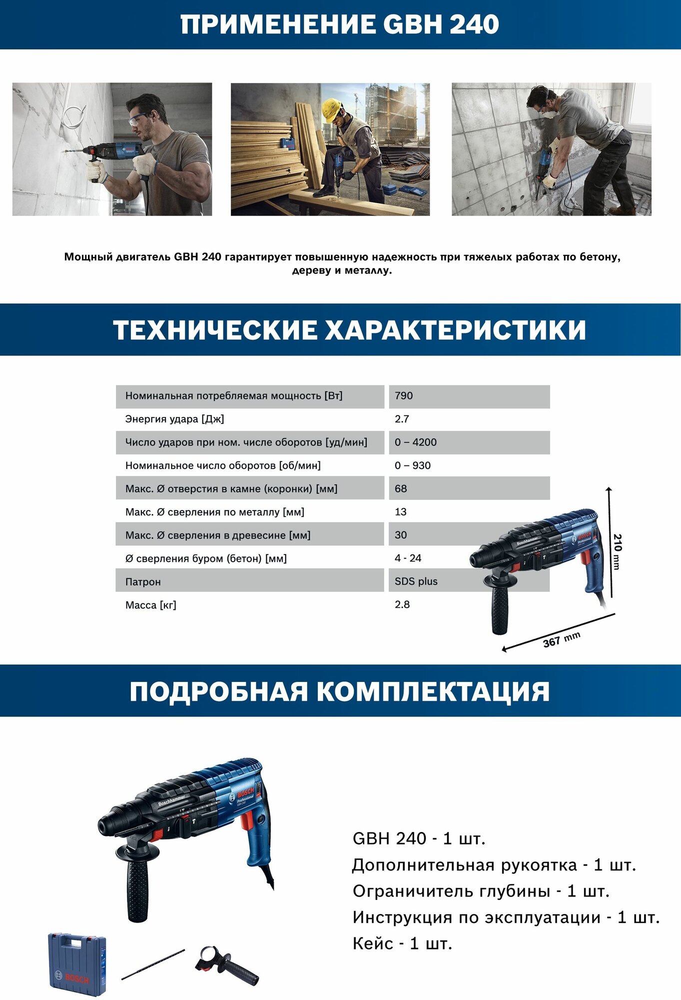 Side handle, drilling depth gauge, carrying case