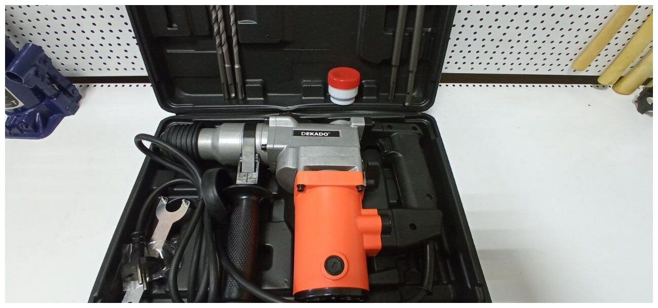 Additional set of brushes, case, wrench, drilling depth gauge, grease pack, 3 pcs. drills, chisel, spear, plastic case, grease