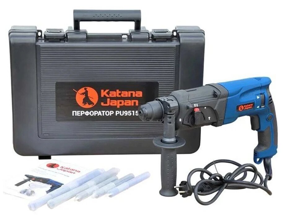 Perforator, drill bit for concrete 3 pcs., chisel 2 pcs., key chuck with adapter, key for chuck, spare carbon brushes, additional handle, drilling depth gauge, case