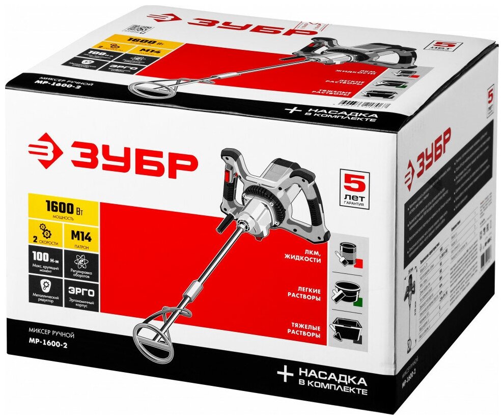 Construction mixer ZUBR MR-1600-2, 2-speed, 1600 W, 26.7 Nm, 0-390 / 0-550 rpm, M14 chuck, up/down mixing