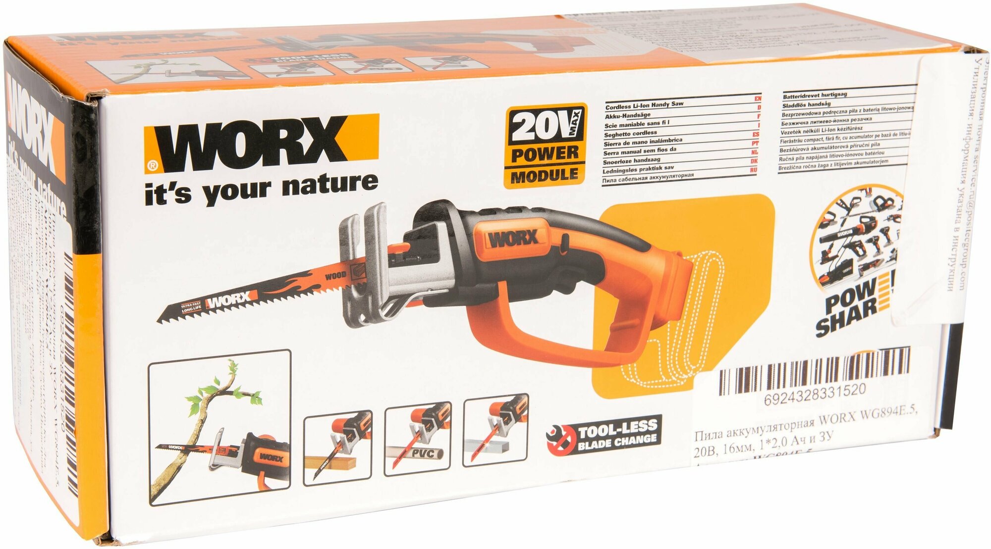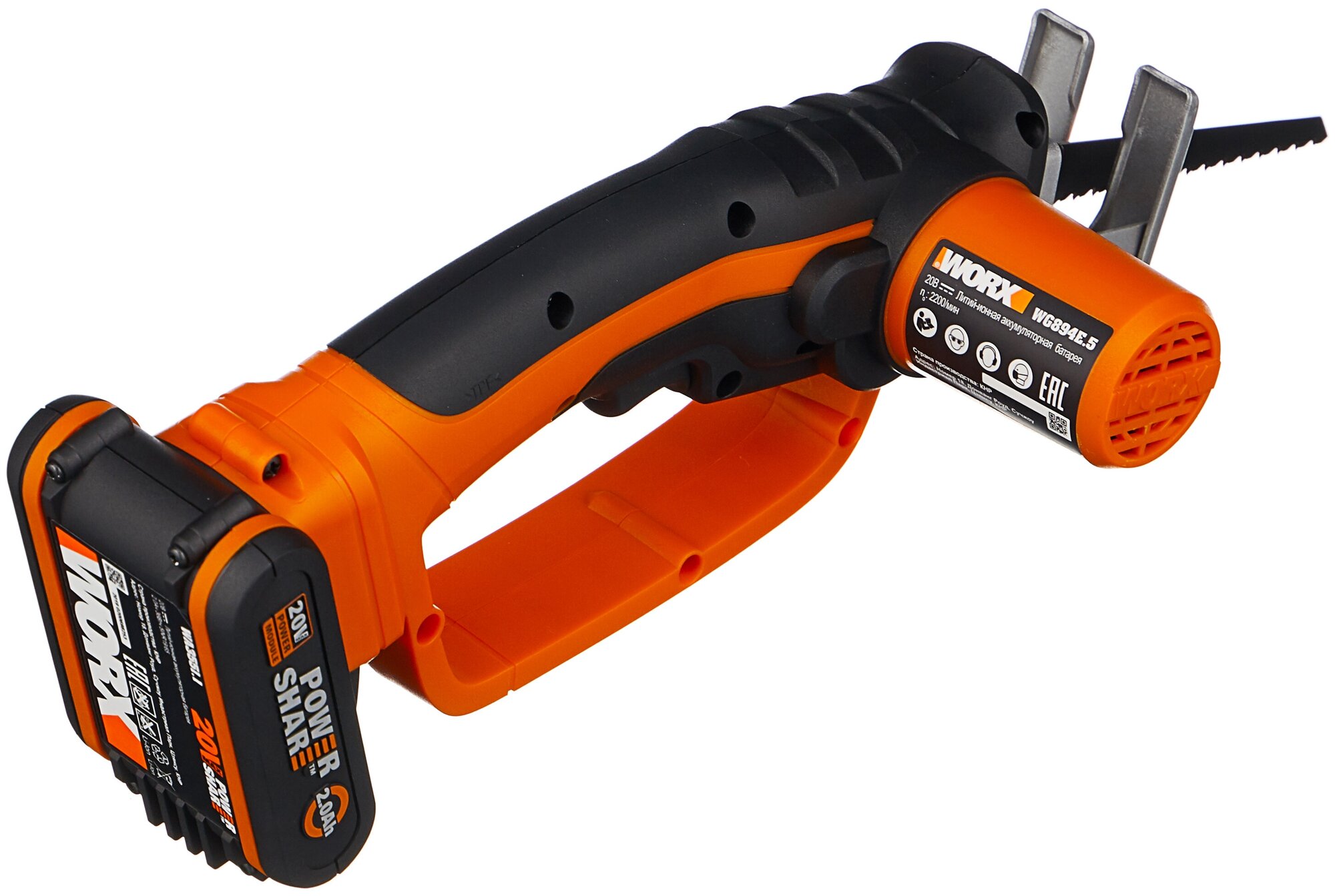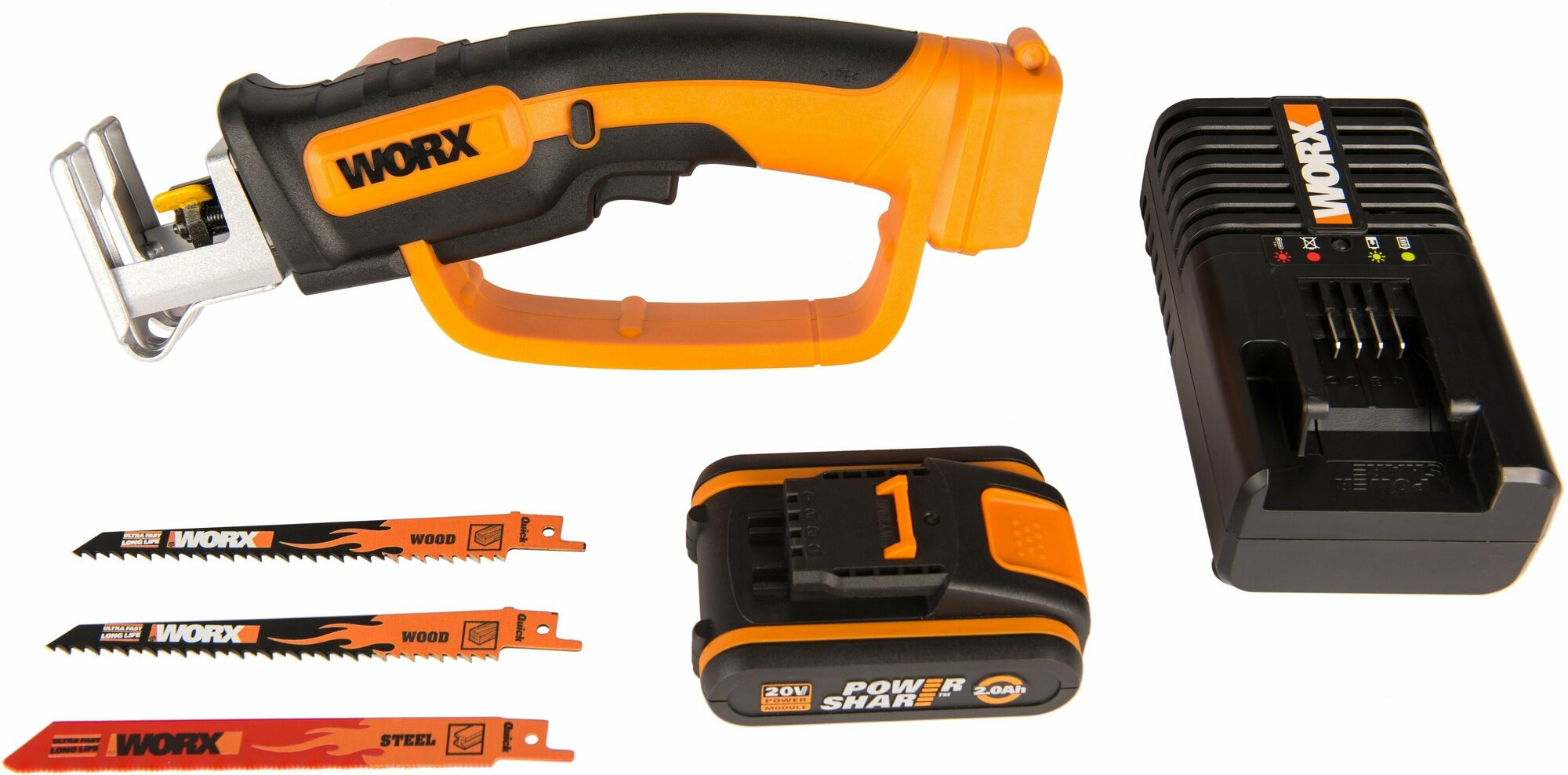 Saw, battery, charger, 2 wood blades, 1 metal blade, instructions