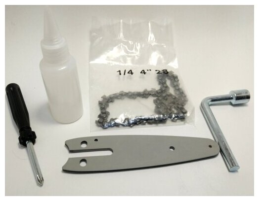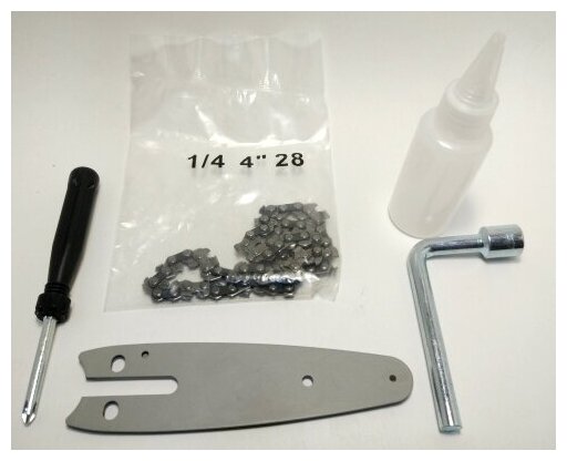 Cordless mini chain saw, 2 batteries, 1 charger, keys, case