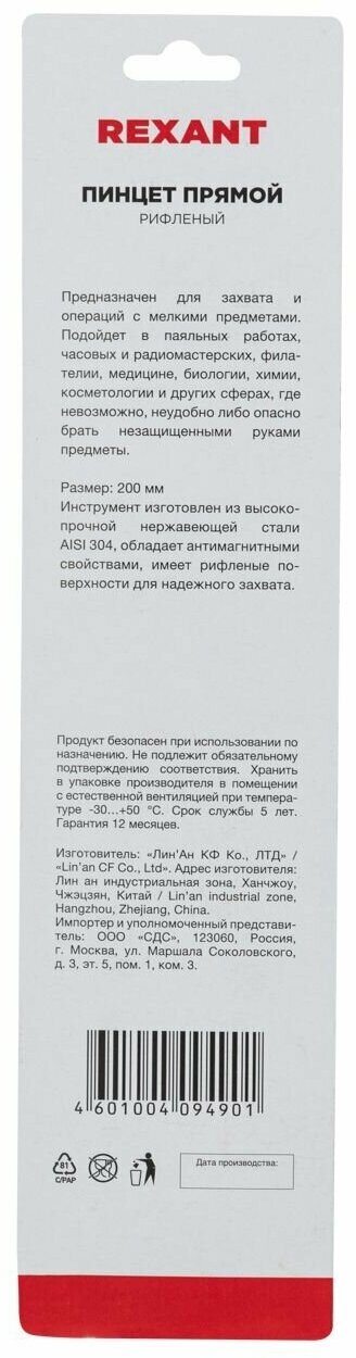 Type: tweezers, tips: straight, features: anti-magnetic, material: stainless steel, profile: flat, length: 20 cm, weight: 51 g
