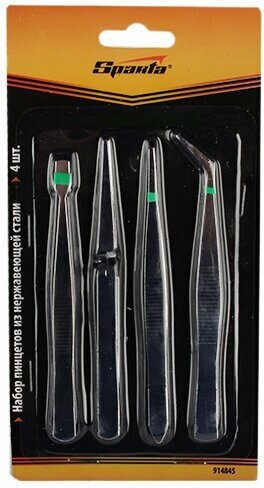 Type: set of tweezers, tips: rounded, curved, straight, material: stainless steel, profile: round, number in the set: 4 pcs., weight: 50 g
