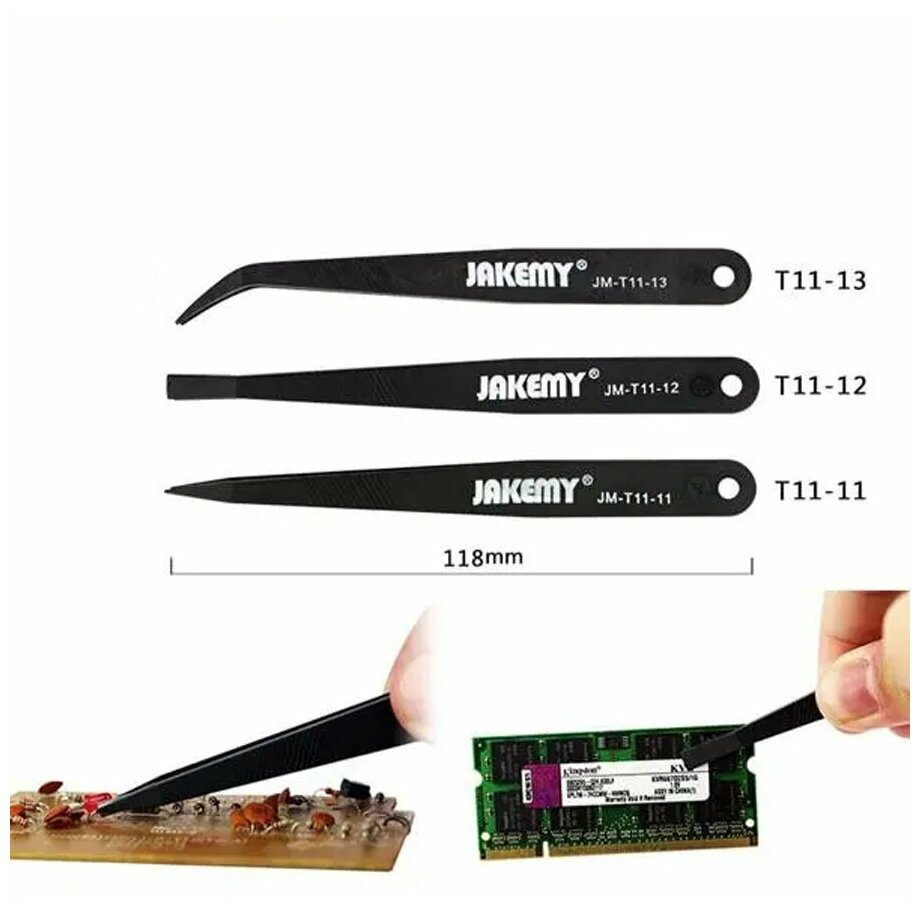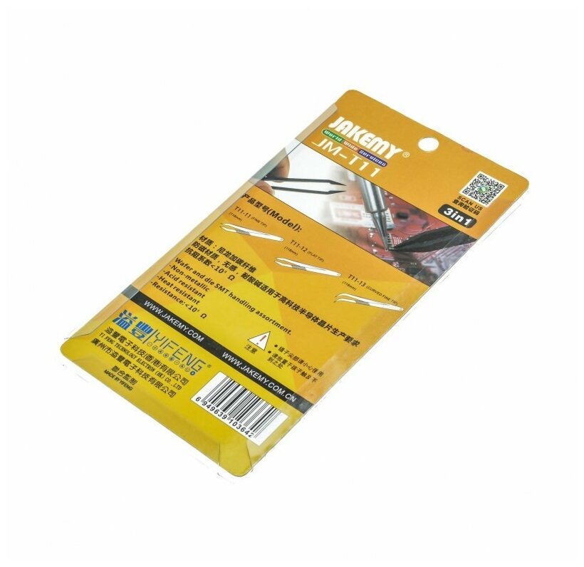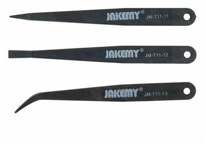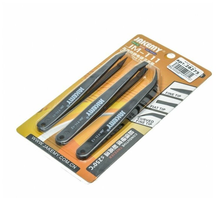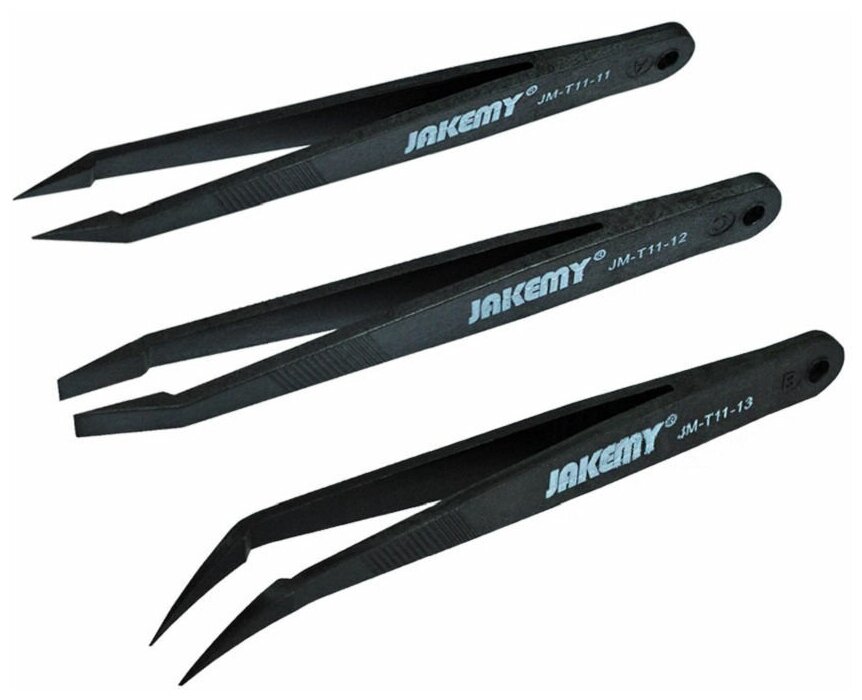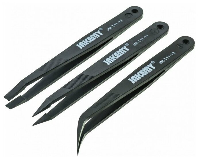 Type: set of tweezers, tips: pointed, curved, straight, features: antistatic, material: plastic, quantity per set: 3 pcs.