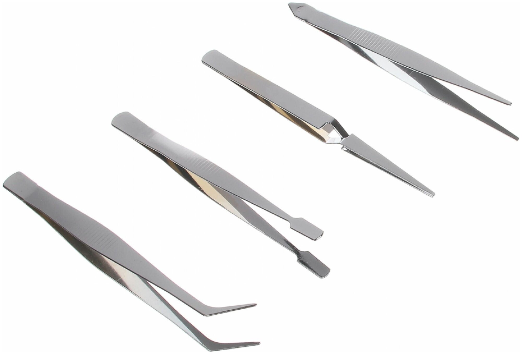 Type: set of tweezers, tips: rounded, pointed, curved, material: stainless steel, quantity per set: 4 pcs.