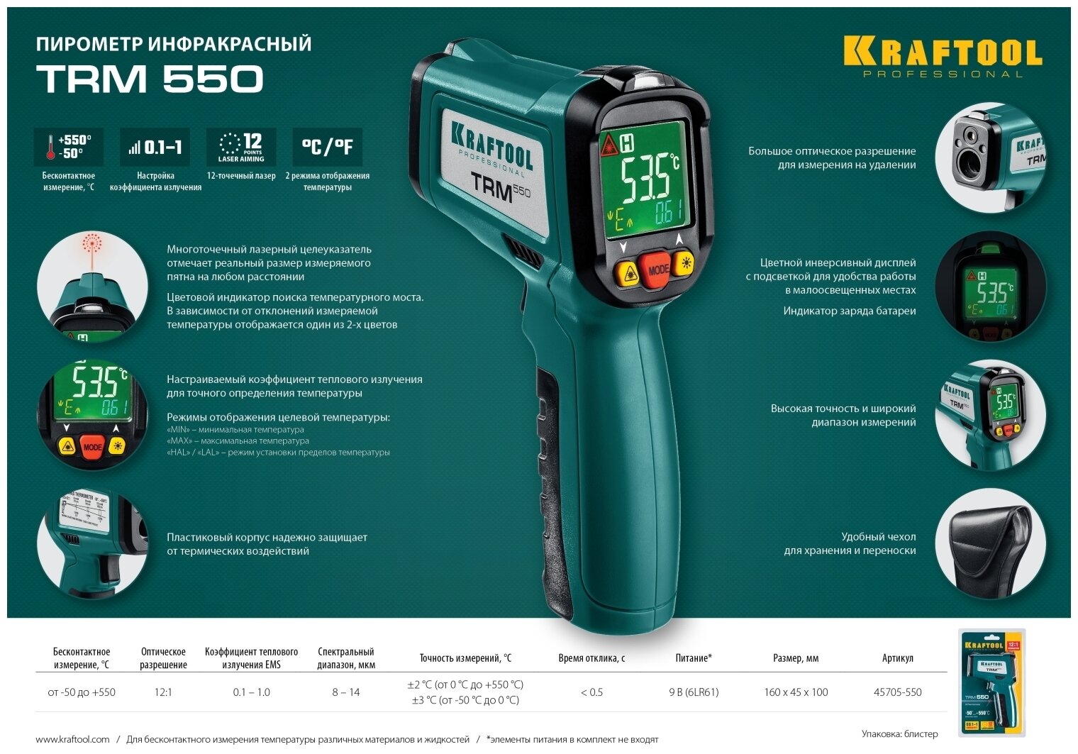 Display backlight; continuous measurement mode; measurement error: ± 3°С from -50°С to 0°С, ± 1.5°С from 0°С to max°С; spectral range: 8-14 microns; the presence of a battery charge indicator; working time: 22 hours without laser, 12 hours �