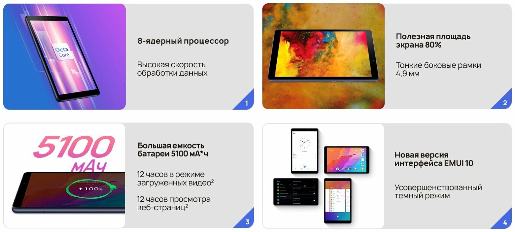 Description: Announced Year: 2020, Screen Diagonal: 8-8.9, Screen Resolution: HD, Screen Refresh Rate: 60Hz, Processor Cores: 8, Charging Port Type: micro-USB, Keyboard: No, Number of Main Cameras: 1, capacity