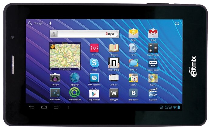Operating system: Android, screen diagonal: 9-9.7, screen resolution format: SD, number of processor cores: 2, keyboard: no, number of main cameras: 1, features: memory card slot, accelerometer, built-in microphone
