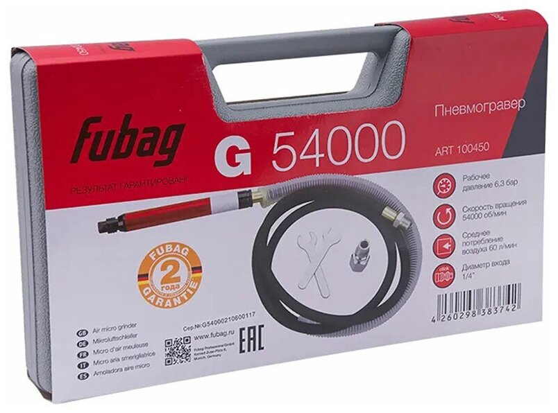 Type: straight grinder, maximum pressure: 6.24 atm, maximum air consumption: 226 l/min, air nozzle diameter, inches: 1/4, connection type: threaded, maximum noise level: 78 dB, case, weight: 0.40 kg