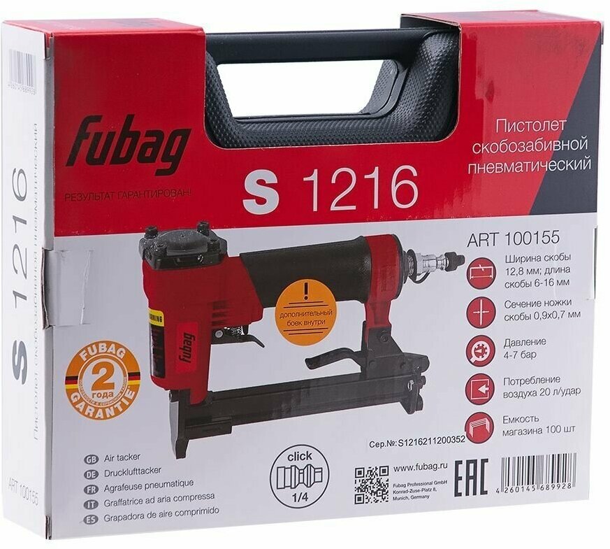 Fastener type: clips, maximum pressure: 7 atm, maximum air flow: 20 l/min, air inlet diameter, inches: 1/4, connection type: rapid, clip type: 80/GA21, maximum clip length: 16 mm, maximum staple width: 1