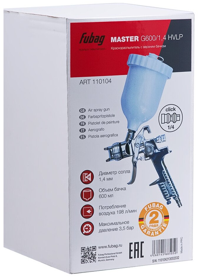 Type: pneumatic spray gun, tank volume: 0.60 l, spraying method: HVLP, material flow control, maximum nozzle diameter: 1.40 mm