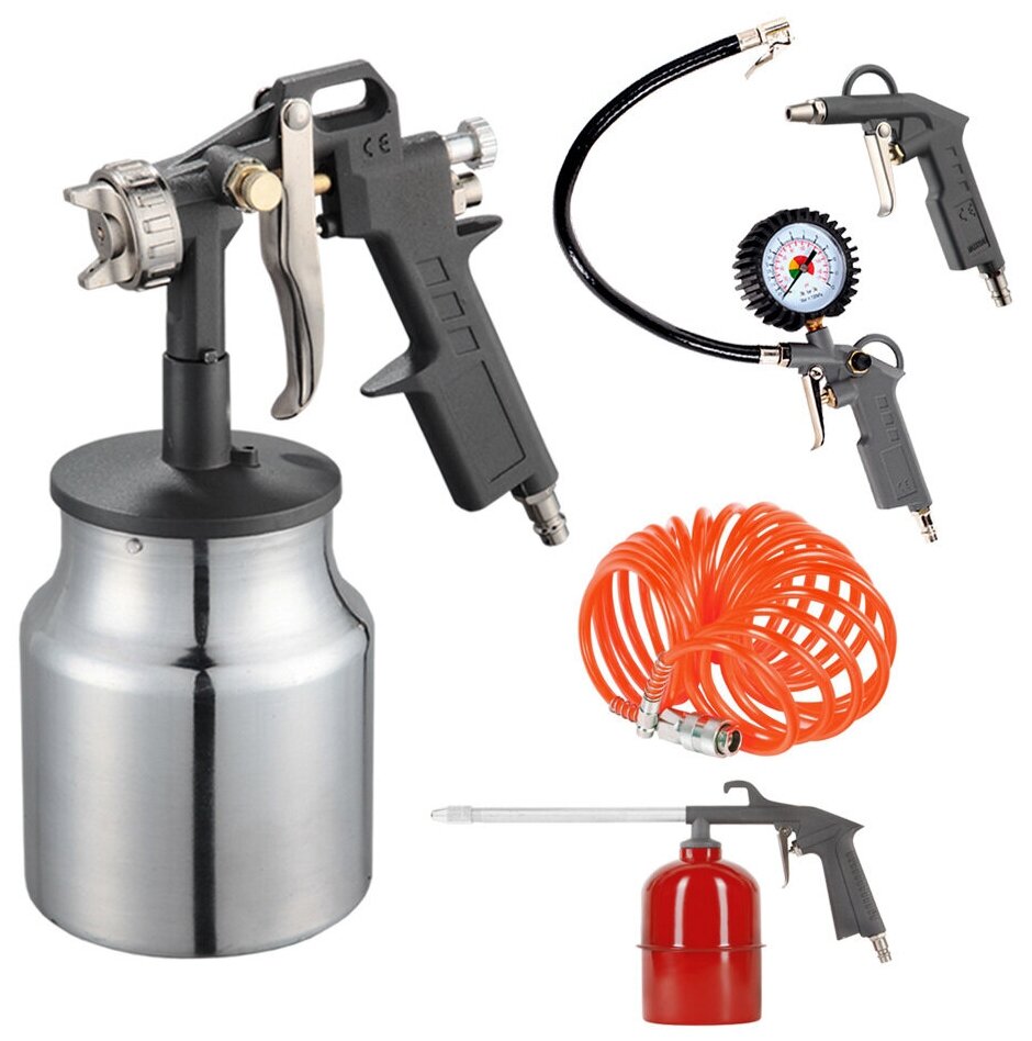 Spray gun with bottom tank, blow gun, tire inflation gun, flush gun, 5 m spiral hose.