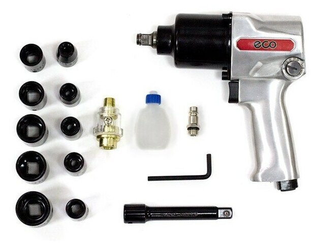 Interchangeable heads 10 pcs. 1/2" to 9, 10, 11, 13, 14, 17, 19, 22, 24, 27 mm., impact extension 1/2" 125 mm., mini-lubricator, 5 mm hex key, nipple, compressor oil