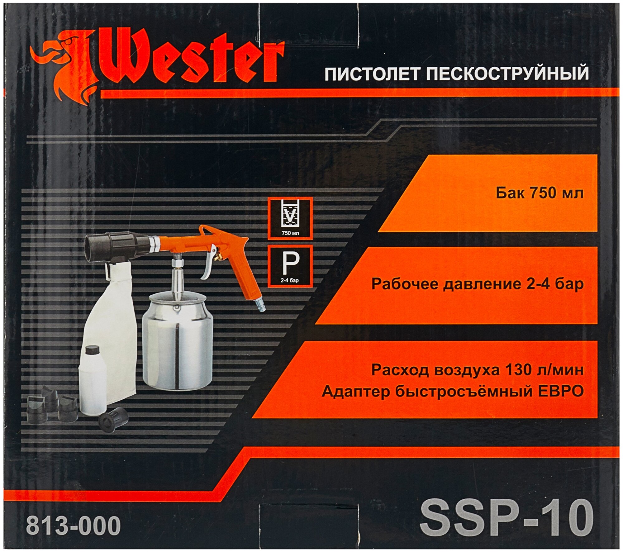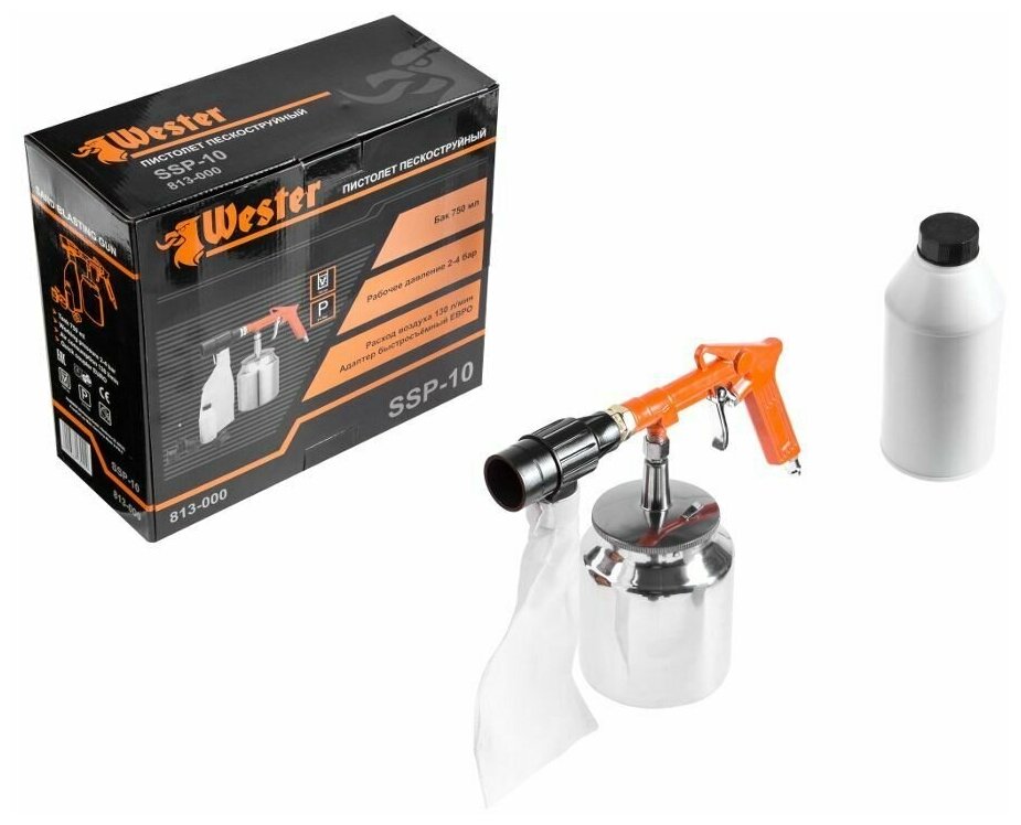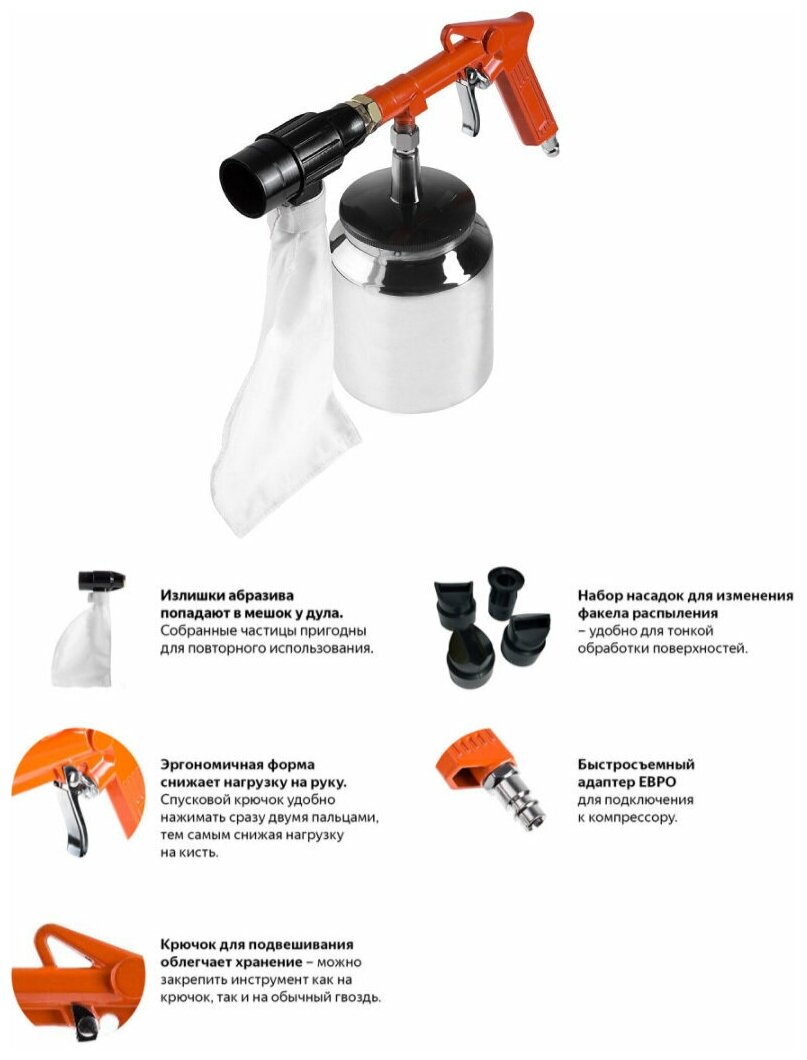 Type: air gun, purpose: sandblast, minimum pressure: 2 atm, maximum pressure: 4 atm, minimum air flow: 130 l/min, maximum air flow: 210 l/min, connection type: rapid, weight: 1.40 kg