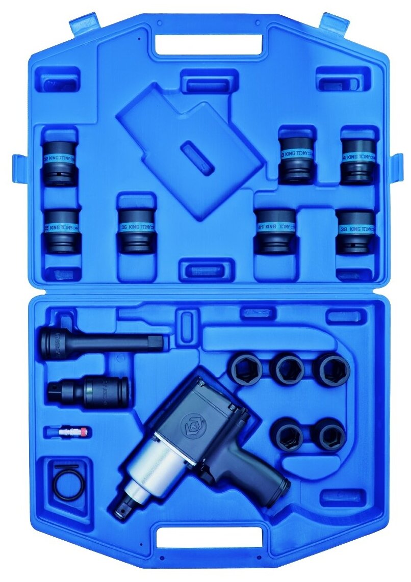 3/4" hexagon impact sockets 6535M: sizes 19, 21, 22, 24, 27, 30, 32, 33, 34, 36, 38, 41 mm; impact extension 3/4", 175 mm KING TONY 6260-07 ; shock cardan 3/4", ball KING TONY 6797; quick-detachable fitting SY-221M; set of clamps: 90603, 90404