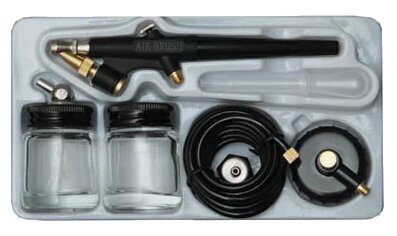 PVC air hose, glass tank 30 ml 2 pcs, service key, pipette for removing paint, adapter 1/4" 5 mm, regulator