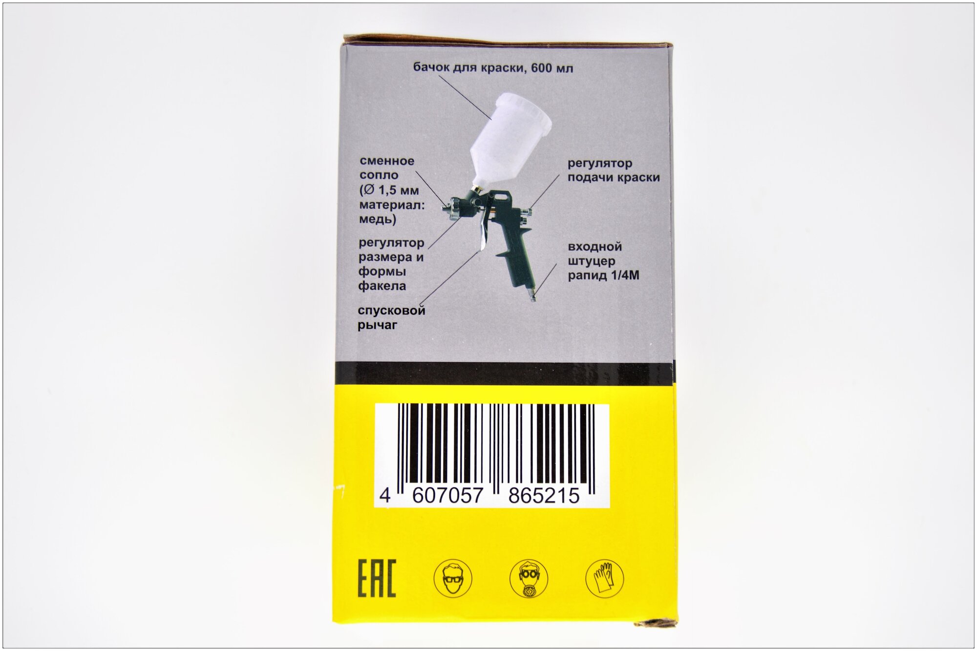 Type: pneumatic spray gun, tank volume: 0.50 l, material supply type: top, material supply adjustment, maximum nozzle diameter: 1.50 mm, type of air and ink flow mixing: internal