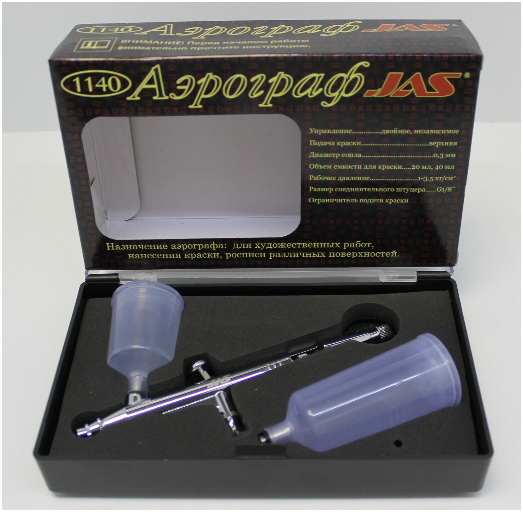 Airbrush Jas 1140 Air Control, instruction in Russian, 20ml paint container, 40ml paint container, convenient storage box